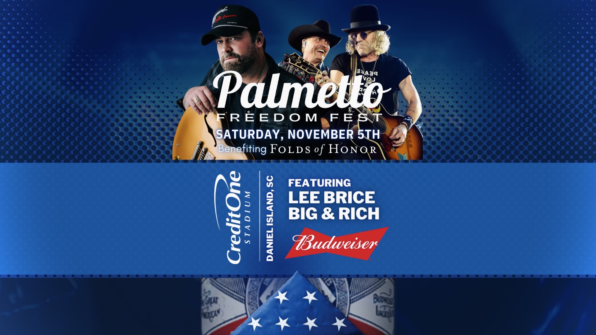 The event features two nights of must-see musicians, including country music stars Lee Brice and Big & Rich and local favorites Edwin McCain and Lauren Hall. Hall and McCain open Freedom Fest at the VIP event Friday, November 4. Lee Brice and Big & Rich headline what will be an incredible night supporting our military and first responders at Credit One Stadium on Saturday, November 5.